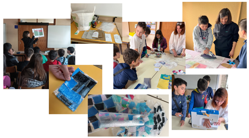 Na oficina, aprendemos a reutilizar sacos de plástico, criando verdadeiras obras de arte, a partir da seleção, aquecimento e fusão de pedaços de sacos de plástico (upcycling) e posterior costura para dar forma aos novos utensílios (carteiras, capas de cadernos, estojos…).