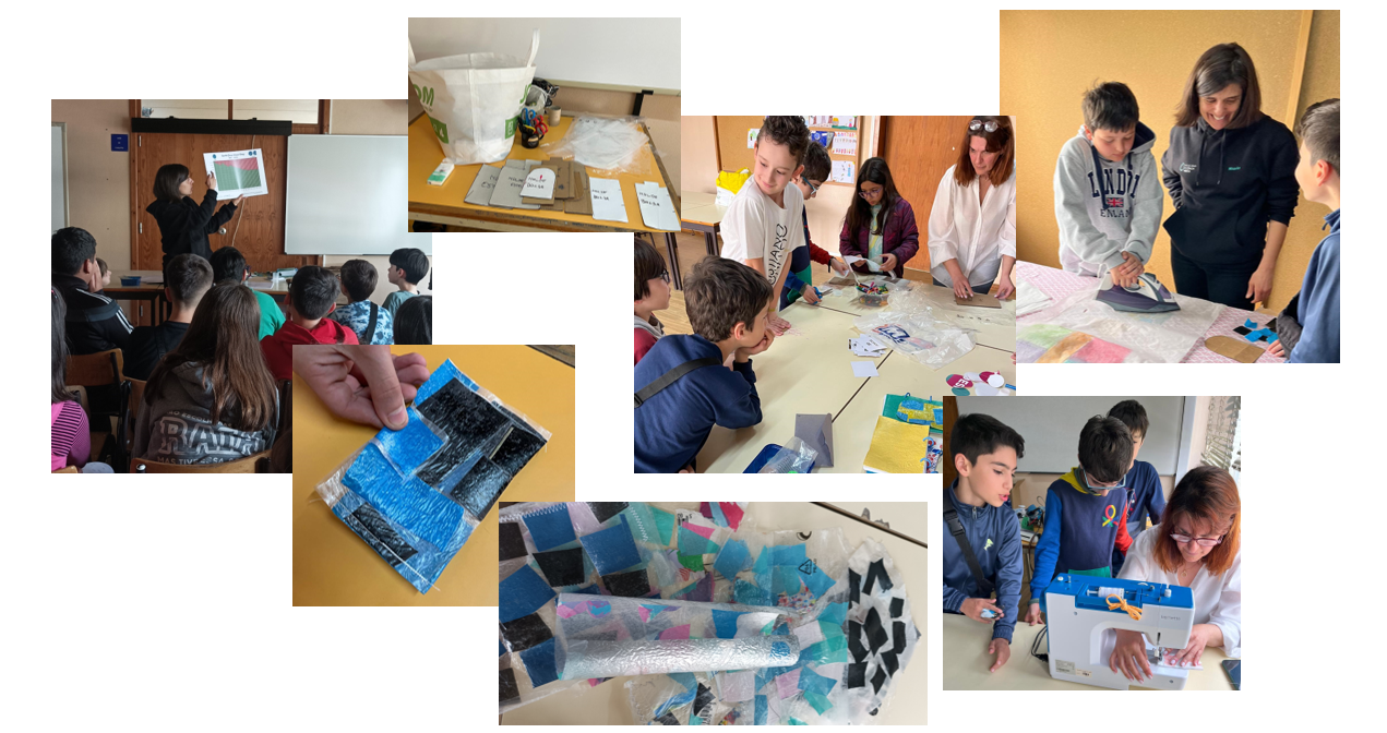 Na oficina, aprendemos a reutilizar sacos de plástico, criando verdadeiras obras de arte, a partir da seleção, aquecimento e fusão de pedaços de sacos de plástico (upcycling) e posterior costura para dar forma aos novos utensílios (carteiras, capas de cadernos, estojos…).