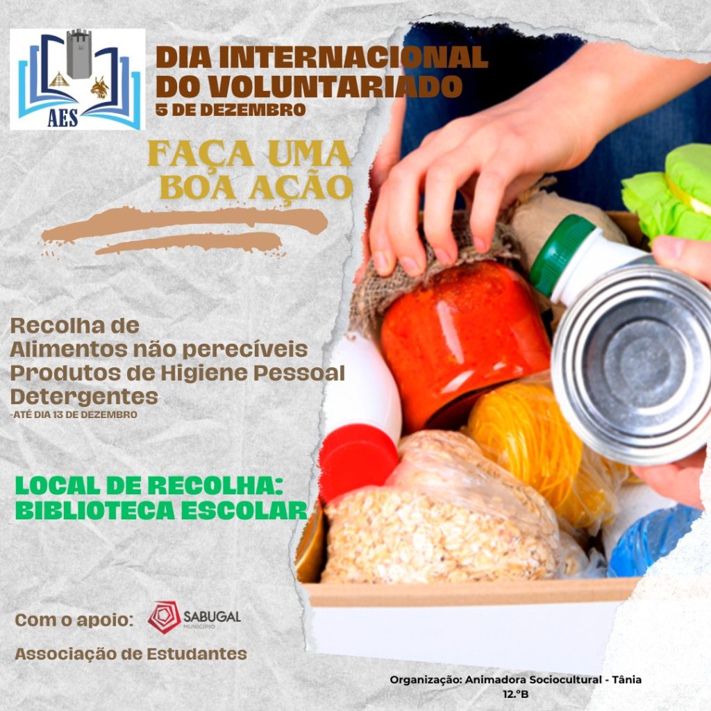 De acordo com o Plano Anual de Atividades, no que diz respeito ao Dia Internacional do Voluntariado que se assinala no dia 5 de dezembro, o nosso Agrupamento associou-se a uma recolha de bens alimentares não perecíveis, produtos de higiene pessoal e detergentes. A entrega dos bens deve ser feita nas Bibliotecas Escolares do 2º ciclo e do secundário.