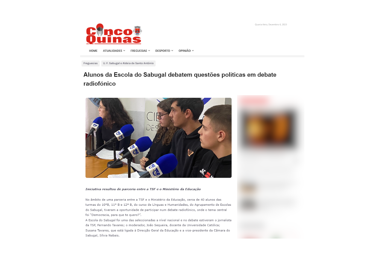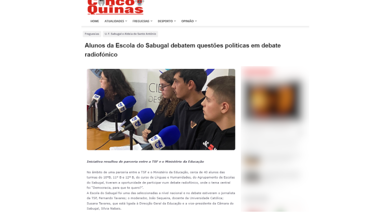 No âmbito de uma parceria entre a TSF e o Ministério da Educação, cerca de 40 alunos das turmas do 10ºB, 11º B e 12ª B, do curso de Línguas e Humanidades, do Agrupamento de Escolas do Sabugal, tiveram a oportunidade de participar num debate radiofónico, onde o tema central foi “Democracia, para que te quero?”.